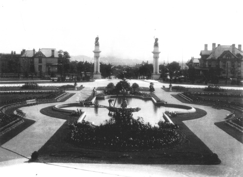 The fountain at the park entrance was particularly grand in this photo taken circa 1900 (the entry statues shown here still exist but are mostly hidden by trees in the contemporary images):